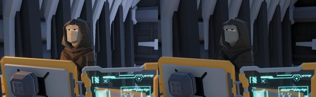 Lighting makes a huge difference in quality, depth, and legibility of a scene. Above left is a scene with a half dozen small hand tuned lights, while above right is the same scene with default lighting.