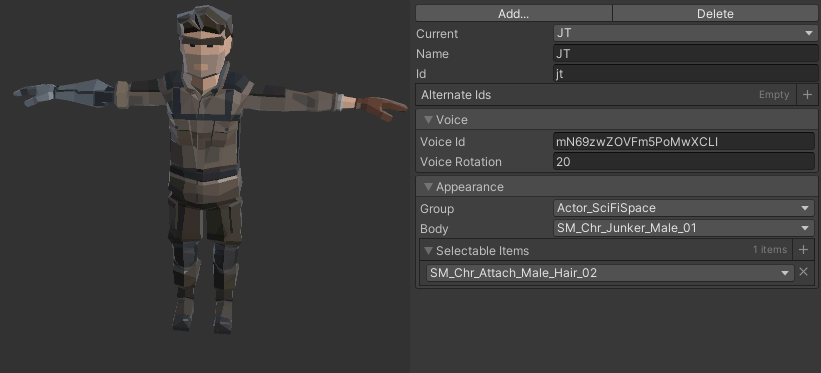Actors are defined by their names, costumes, and voice. I made a tool (below) to modify names, the base geometry, accessories, and to change voice settings. The tool made building out the cast go quickly. And a single āActorā which could configure itself to āwearā any costume greatly simplifies the implementation.